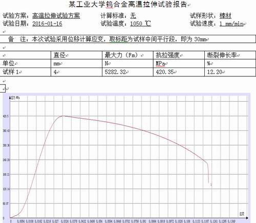 該客戶是國家的一所“211工程”重點建設(shè)院校,是國內(nèi)高溫合金領(lǐng)域的權(quán)威院校,此次委托我方做鎢合金高溫測試。鎢合金是以鎢為基加入其他元素組成的合金。在金屬中,鎢的熔點最高,高溫強度和抗蠕變性能以及導(dǎo)熱、導(dǎo)電和電子發(fā)射性能都好,比重大,除大量用于制造硬質(zhì)合金和作合金添加劑外,鎢及其合金廣泛用于電子、電光源工業(yè),也在航天、鑄造、武器等部門中用于制作火箭噴管、壓鑄模具、穿甲彈芯、觸點、發(fā)熱體和隔熱屏等。如下是該院校用三思泰捷試驗機所做的鎢合金高溫拉伸試驗相關(guān)報告及參數(shù):