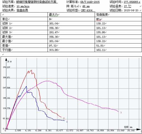 該客戶是一家專業(yè)從事玻璃鋼系列產(chǎn)品的研發(fā)、設(shè)計(jì)、制造的民營企業(yè)。該企業(yè)的產(chǎn)品廣泛應(yīng)用于汽車配件廠家、紡織印染、化工、電力、市政、能源、軍工、民用等多個領(lǐng)域。玻璃纖維增強(qiáng)塑料(FRP)是一種以玻璃纖維增強(qiáng)不飽和聚酯、環(huán)氧樹脂與酚醛樹脂為基體材料的復(fù)合塑料。玻璃纖維增強(qiáng)塑料也稱之為玻璃鋼,是一種品種繁多,性能各別,用途廣泛的復(fù)合材料,作為復(fù)合材料的一種,也因此因其其獨(dú)特的性能優(yōu)勢,在航空航天、鐵道鐵路、裝飾建筑、家居家具、建材衛(wèi)浴和環(huán)衛(wèi)工程等等相關(guān)行業(yè)中得到了廣泛應(yīng)用。因此,在一定意義上說,玻璃纖維增強(qiáng)塑料材料是一種應(yīng)用范圍極廣,開發(fā)前景極大的材料品種之一。該客戶此次委托了我司做了玻璃纖維增強(qiáng)塑料的彎曲試驗(yàn)方案,如下的相關(guān)數(shù)據(jù)及參數(shù)是用我們?nèi)继┙莸脑囼?yàn)機(jī)試驗(yàn)得出的結(jié)果: